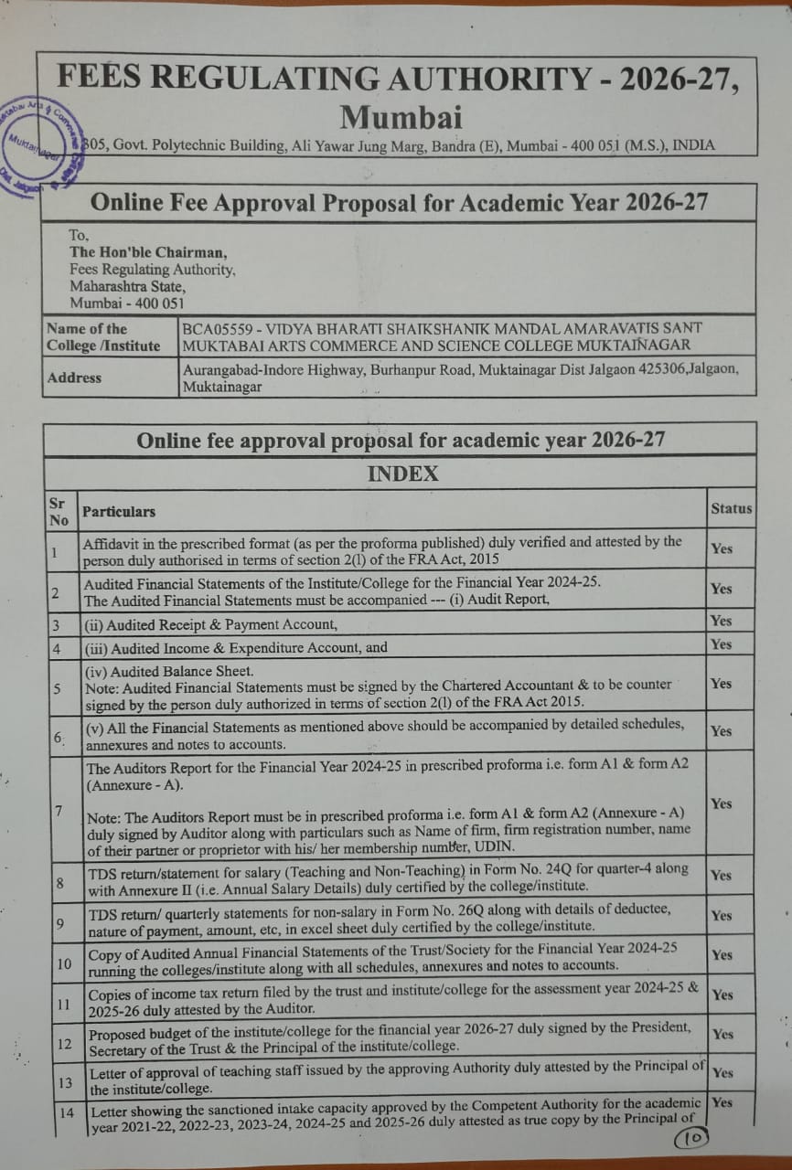 Sant Muktabai Arts, Commerce & Science College, Muktainagar is established in 1983 with motto of taking education to rural area to brighten the future of modern India. The college has been established by Vidya Bharati Shaikshanik Mandal, Amaravati, a renouned institution established by visionary educationist Shri. Devisinghji Shekhawat and the First Lady President of India Smt. Pratibhatai Devisingh Patil. The college has been re accredited by NAAC with B grade having 2.87 CGPA. The college is ISO 9001:2015 certified. KBCNMU Jalgaon has given A grade to the college in the college academic audit.